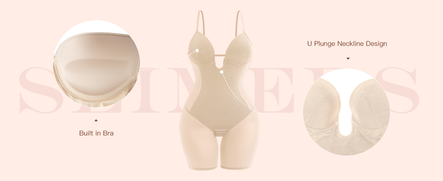 U Plunge Mid Thigh Shapewear Bodysuit - Pink