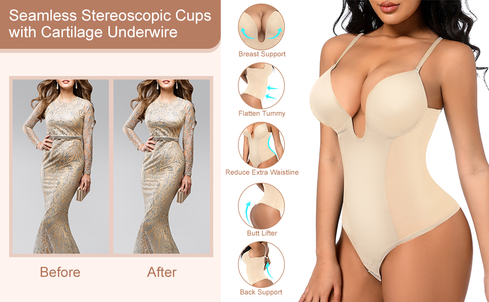 DESIGNED TO BE SEXY: Our body shaper has a thong design that helps make your butts look bigger and enhance your natural curves. The backless design is perfect for wearing under open back tops and dresses. You can wear it for formal occasions and everyday clothes, no matter the season.