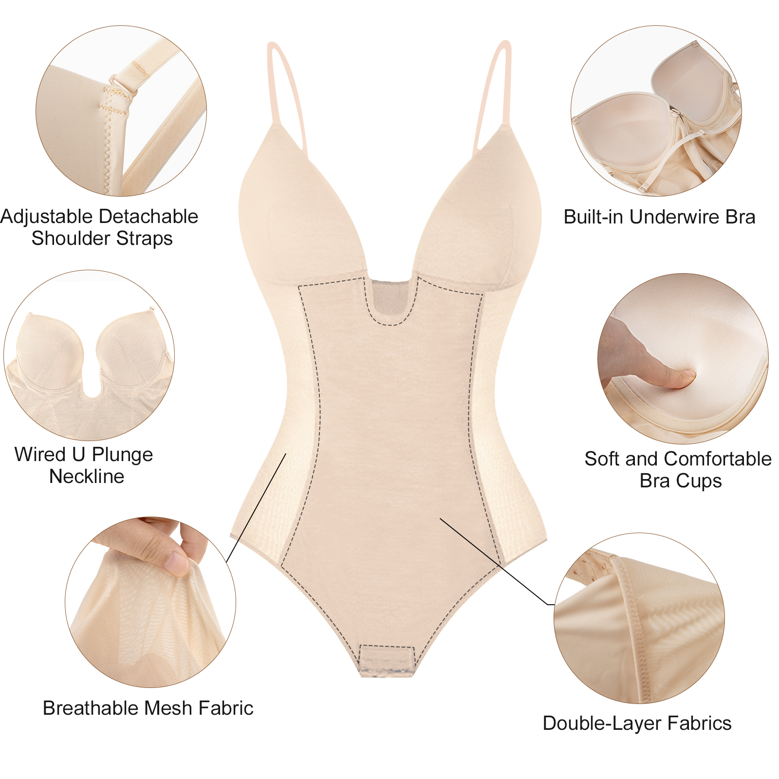 U Plunge Thong Shapewear Bodysuit - Beige