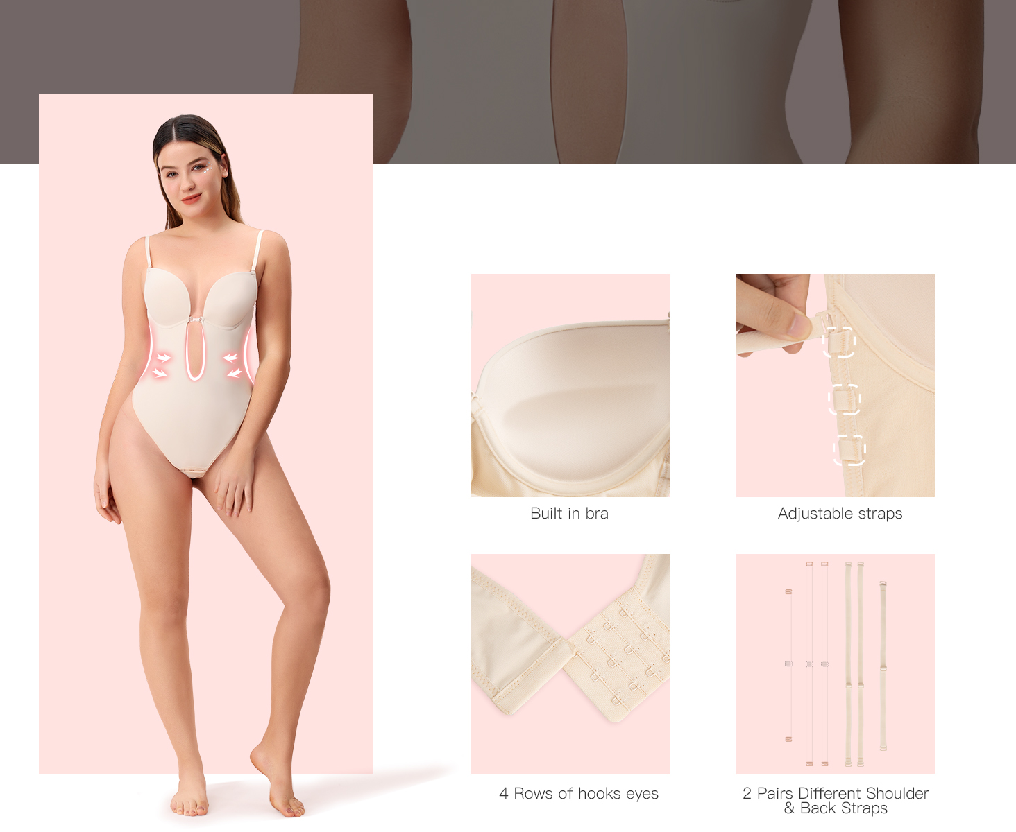【Seamless & Stereoscopic Cups】We have increased the cup size of women's shapewear for a better fit. And this Bodysuit Shapewear is made with seamless & stereoscopic cups for more skin-friendly and comfortable support, and not empty. Package Including 1 piece of Plunge Shapewear, 1 Pair Elastic Shoulder Straps, 1 pair of Clear Shoulder Strap,1 piece of Clear Back Strap, 1 Piece of Elastic Back Straps, and 2 pieces of Different Length Straps between the two cups.